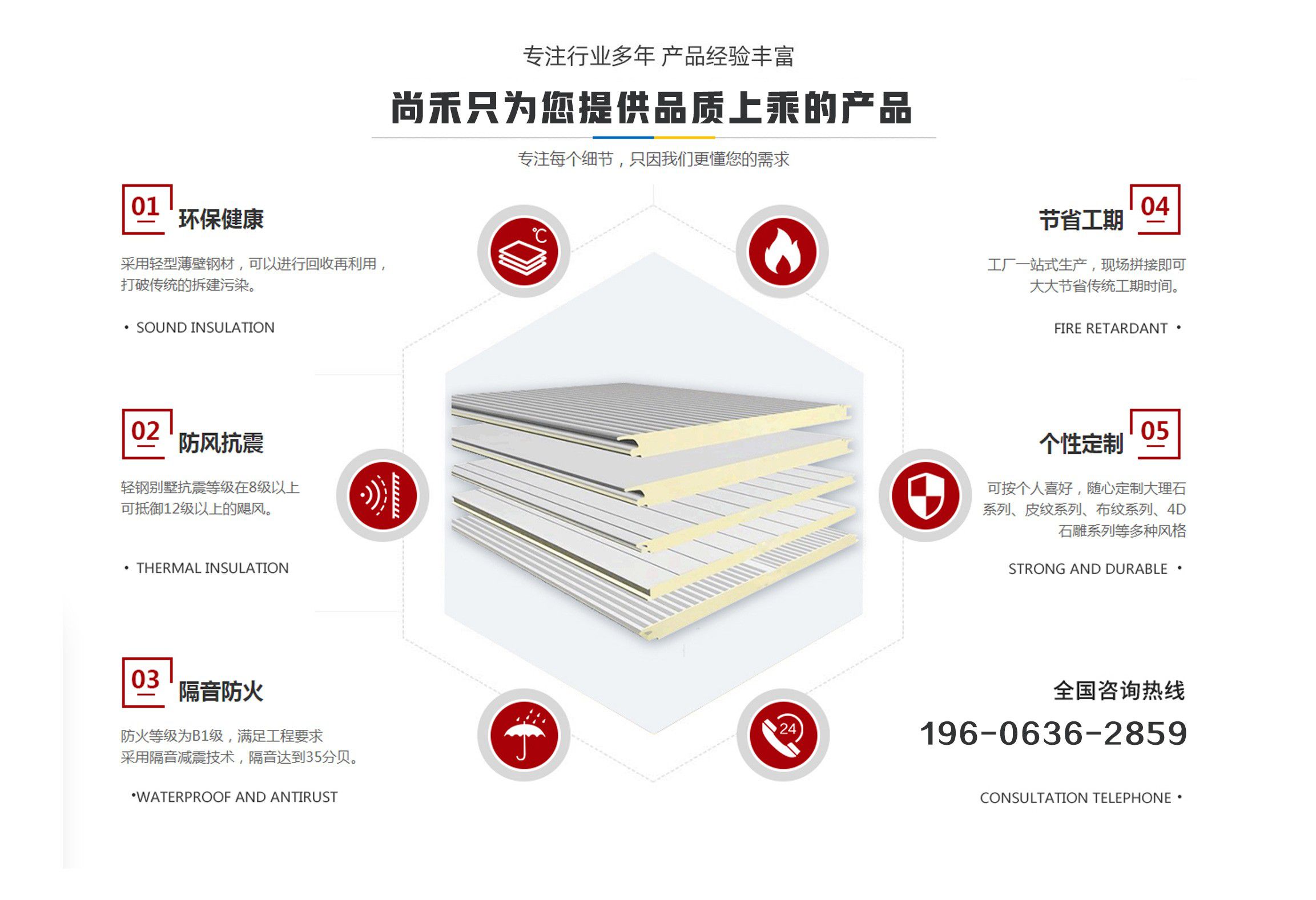 山東尚禾經貿有限公司是集板材設計、研發(fā)、生產、施工、一體化的科技公司,并在同行業中率先通過了質量、環(huán)境、安全管理體系認證。公司2011年投入資金2000余萬元引進世界先進的聚氨酯節(jié)能板連續(xù)生產線、意大利進口發(fā)泡系統,采用六組份在線自動操作混合澆注技術,在線一次性完成社會配料中心或工廠的配比混合工藝,并可以根據溫度在線自動調整,從而生產處與眾不同的高強度、節(jié)能型、綠色環(huán)保的聚氨酯夾芯板。(其使用年限高于同行業其他品牌5-10年) 公司主要經營范圍包括聚氨酯夾芯板,PU夾芯板,冷庫板,潔凈板,聚氨酯冷庫板,冷庫保溫板的設計、生產、銷售、技術指導、安裝及一體、以及進出口業務,是中部六省最大的綠色節(jié)能建材生產基地。聚氨酯夾芯板年產200萬平方米、PU夾芯板、冷庫保溫板500萬平方米、鏈整產業綜合實力,開創(chuàng)了六省至中西部創(chuàng)新型中小名企總部基地,并將著力推進中國中西部地區集成房屋住宅產業化發(fā)展進程。 科技創(chuàng)新、節(jié)能典范。千萬間始終秉承“誠信、合作”的企業文化精髓,長期致力于鋼板材結構節(jié)能建筑產業,愿與社會各界攜手合作,共鑄綠色、環(huán)保美好未來。 產品具有良好的絕熱、阻燃、隔音、環(huán)保、耐久性能,可廣泛應用于工業、商用建筑內外墻、以及民用建筑外墻保溫、空調通風系統、專用防火保溫門等領域。 我們始終秉承...